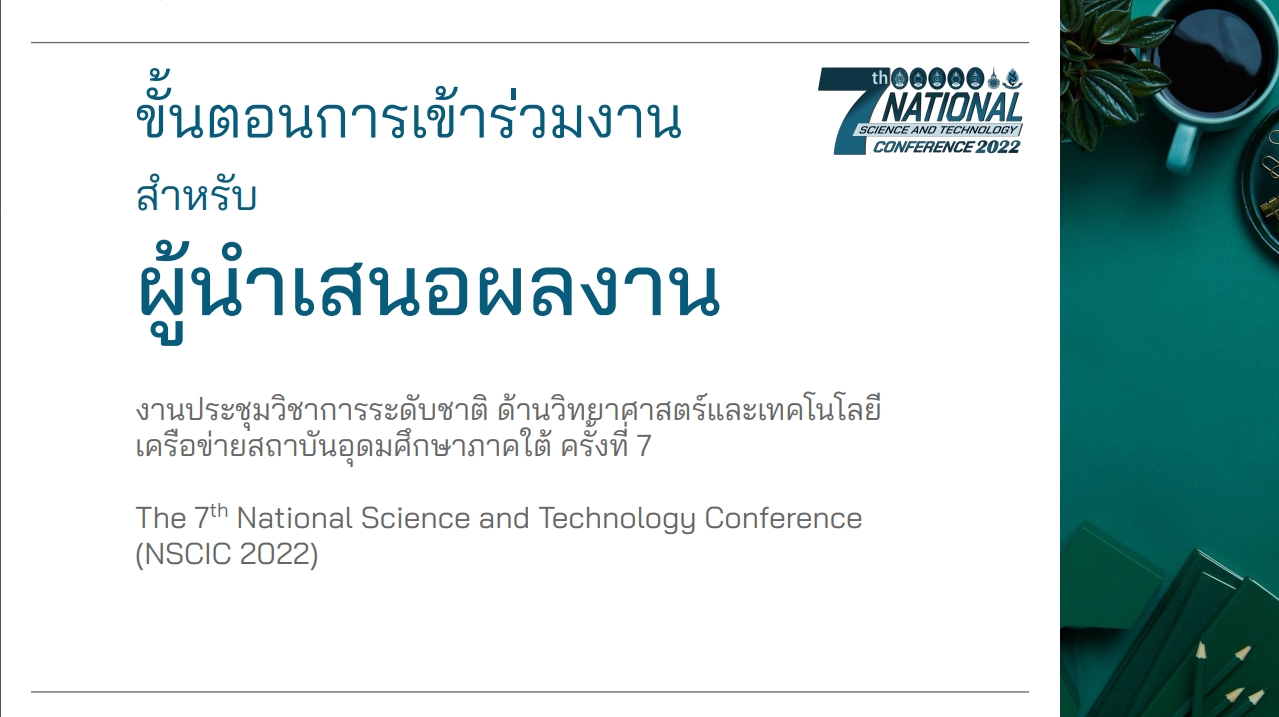 | ข่าวประกาศที่ 4 ขั้นตอนการเข้าร่วมงาน สําหรับ ผู้นําเสนอผลงาน งานประชุมวิชาการระดับชาติ ด้านวิทยาศาสตรแ์ละเทคโนโลยีเครือข่ายสถาบันอุดมศึกษาภาคใต้ ครั้งที่ 7 |